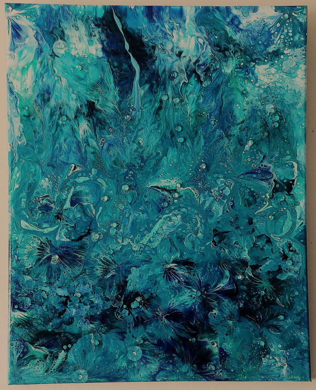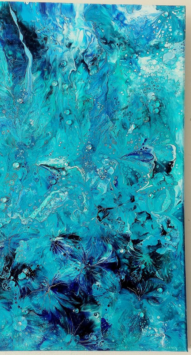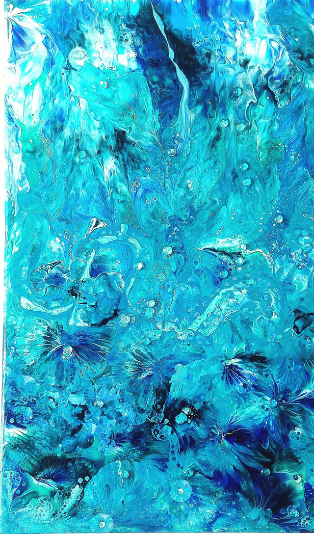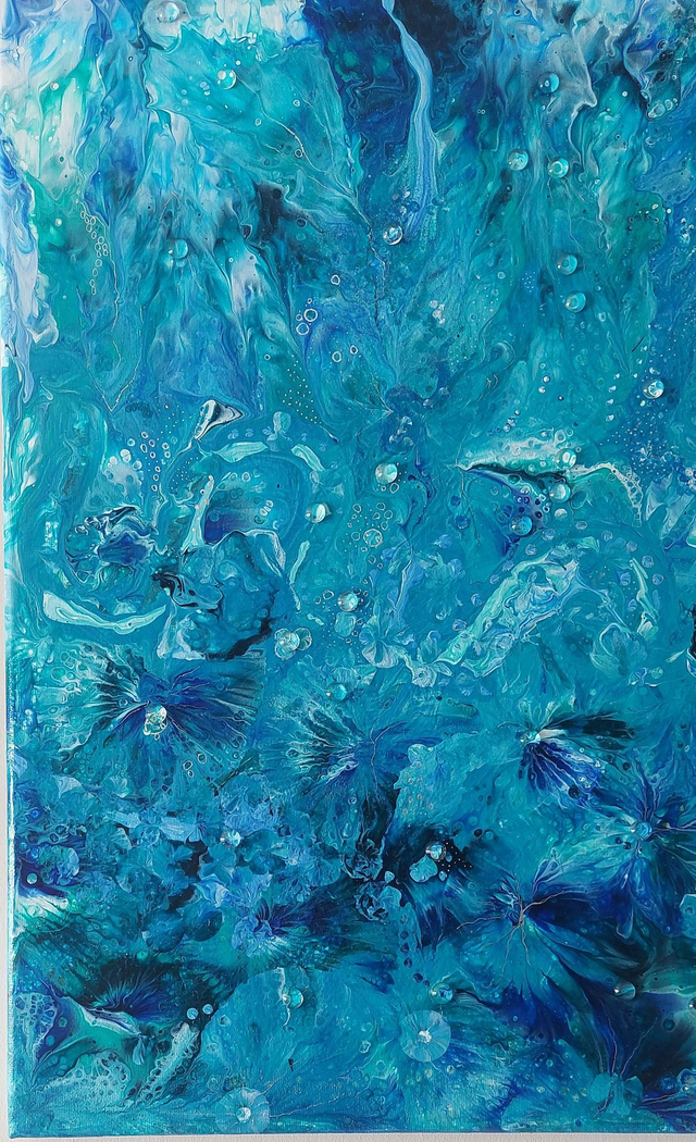 The captivating flow of turquoise, blues and green will enchant any lover of the ocean. This tactile artwork has been embellished with glass cabochons to accentuate details and give the appearance of droplets - a truly beautiful piece.