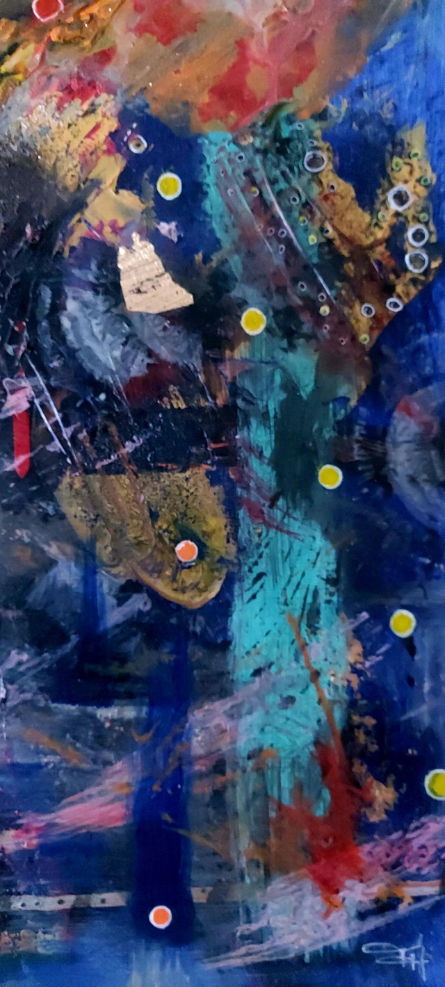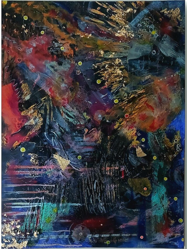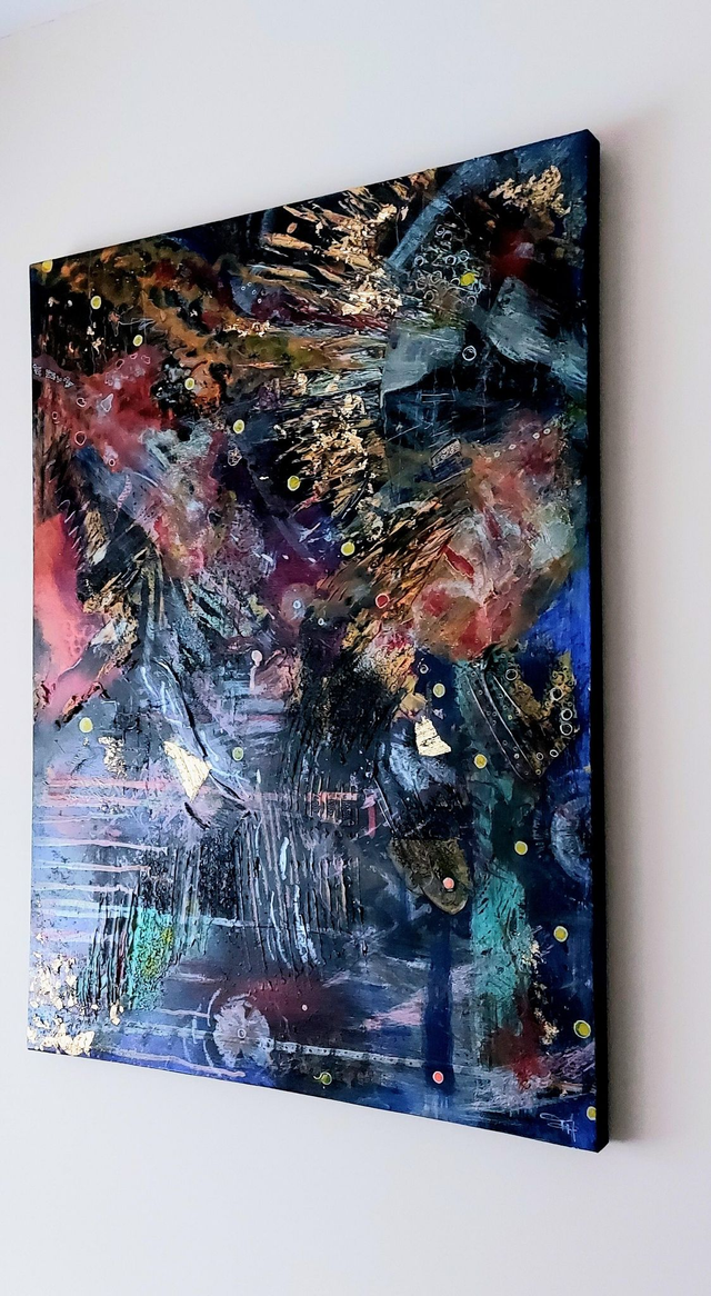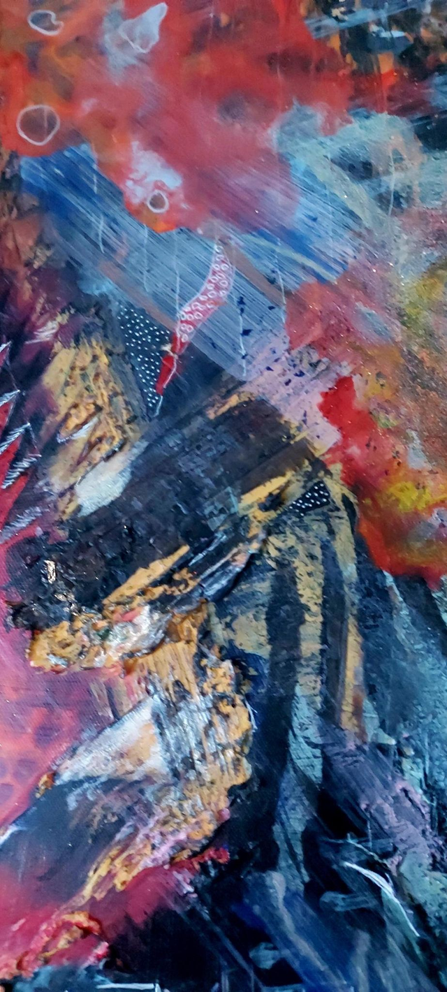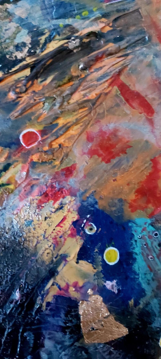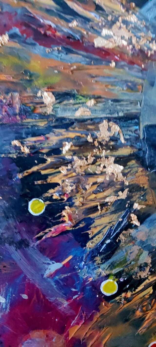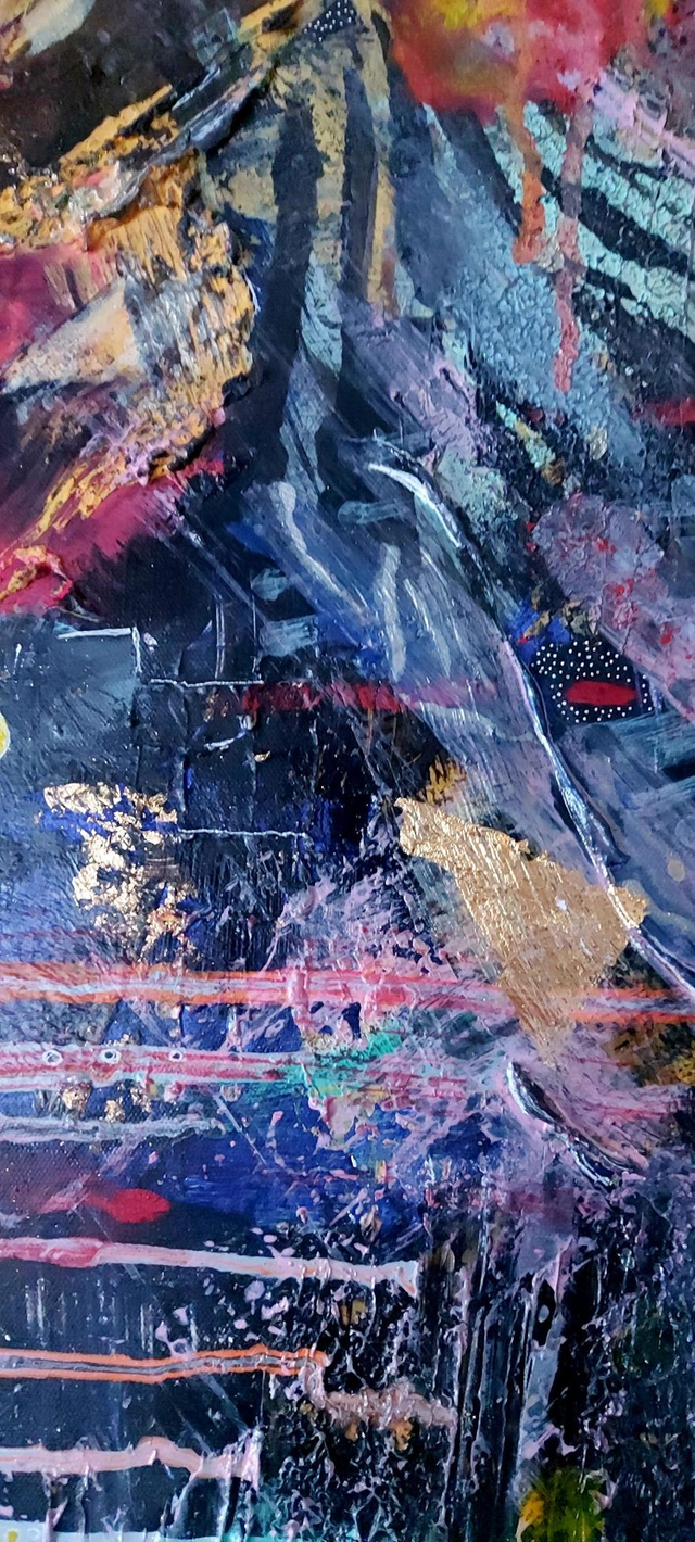 Textured artwork bursting with energy created with mixed media including acrylic paint & gold leaf on canvas measuring 780x570x25mm