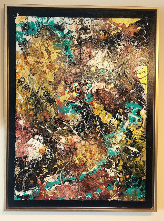 Acrylic paint & gold leaf on canvas, displayed and fixed within a light gold floating frame measuring 600x450x22mm